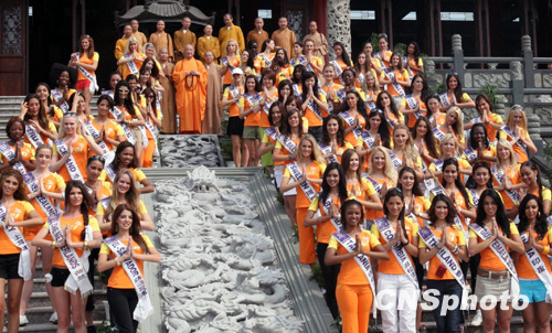 图为南海禅寺法师与各国佳丽在大雄宝殿前合影。中新社发 钱兴强 摄