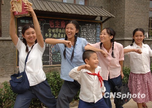 8月21日,冯氏新片《唐山大地震》首次开放在唐山外景地的媒体探班。耗资千万的场景按照历史照片打造,真实再现了70年代街景,而这些场景在仅仅拍摄4天后就将被推掉。群众演员也将达5万-8万人次。导演冯小刚、主演徐帆、张国强出现在片场。图为拍摄间隙,群众演员在毛主席语录前大摆造型。中新社发 李学仕 摄