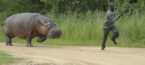 据英国媒体23日报道,乌干达猎场一只大河马在吃午餐时遭到一名看守人打扰,河马怒了,突然冲了出来,看守人被吓得落荒而逃。