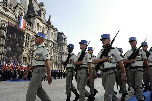 8月25日,法国在巴黎市政厅门前举行仪式庆祝巴黎解放65周年。1944年8月25日,在盟军的强大攻势下,德国驻巴黎的军队被迫投降。法国共产党领导人民起义,戴高乐将军进入巴黎接管政权,巴黎解放。图为外籍军团士兵在法国巴黎市政厅门前参加巴黎解放65周年纪念活动。