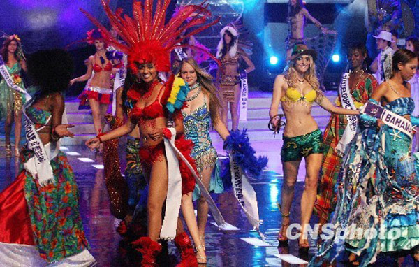 图为参赛佳丽展示各国民族服饰。中新社发 钱兴强 摄
