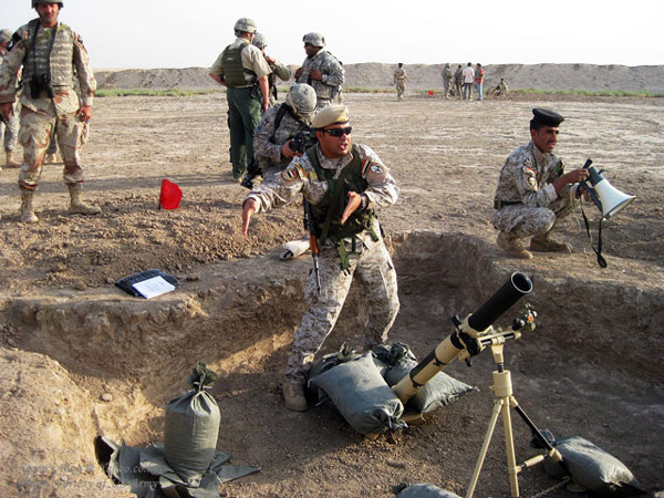 伊拉克新军教官向新学员讲解81毫米迫击炮的射击要领。
