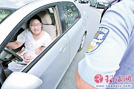 郑州交警一大队民警在金水路与经七路交叉口执勤时,突然发现一辆银色本田轿车由东向西驶来,车内女司机的怀中抱着一名婴儿,正在喂奶。民警遂上前将其拦下,并责令其将婴儿递给旁边的朋友。得知司机高某急着去医院,民警在对其进行批评教育后,将其放行。