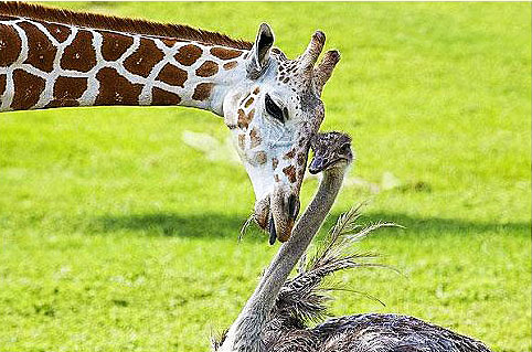 在美国佛罗里达州坦帕湾的布施花园,三岁的长颈鹿Bea和鸵鸟Wilma结为好友。
