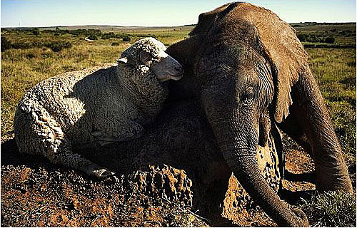 在南非,这只8个月大的小象Themba是个孤儿,它与绵羊Albert关系不错。