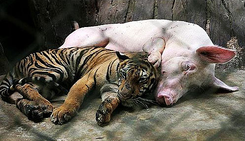 在泰国的诗提查老虎园,猪和虎仔“同床共枕”。