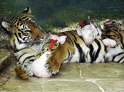 这只老虎妈妈是喝猪奶长大的,她对待小猪仔如同自己的孩子。