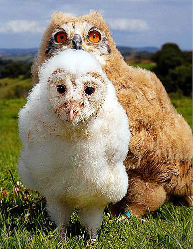 白色猴头鹰和这只“混血”雕鸮形影不离。