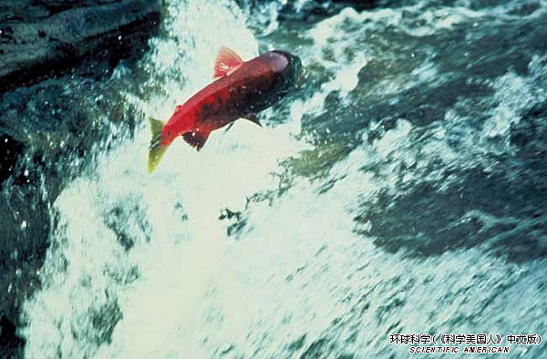 大麻哈鱼:成年大麻哈鱼(salmon)都生活中海洋中,但它们确是在淡水河流中被孵化出来。每年秋天,成年大麻哈鱼就会回游到他们自己被孵化出来的地方产卵。它们回游过程非常艰辛,首先必须克服流水强有力的冲击,还得躲开那些饥饿的在河里觅食的熊,有时它们还必须通过跳跃来通过瀑布。对大鳞大麻哈鱼(Pacific salmon)而言,这是一次单向的旅程。它们沿河流上游会耗费大量的精力与流水抗争,在产卵之后,精疲力竭的它们就很快死去了。