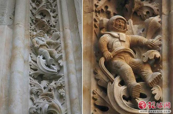 在西班牙萨拉曼卡市一个远古大教堂上竟有着神秘的太空人浮雕。这是伊诺尼马斯大教堂,修建于公元1102年。在浮雕上雕刻着神话中的动物和圣徒,令人惊奇的是其上还有一个特殊的图案格外吸引人,这是一个太空人的图案。这个图案是很清晰的身着宇航服的宇航员,该图案让游客们产生了许多遐想:有可能在一千多年前太空人能够穿越时空隧道。