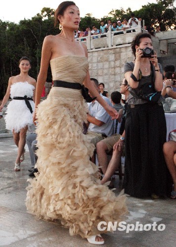 9月18日晚,正在海南三亚参加2009新丝路模特大赛总决赛的选手,在三亚森林公园上演纽约时装周作品展示。图为模特展示某品牌时装作品。中新社发 钱兴强 摄