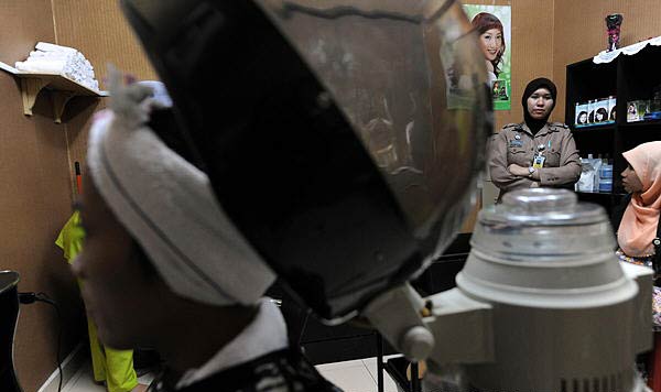 马来西亚首都吉隆坡郊区一个女子监狱中开设了一家美容院。在严密的监视下,这家在马来西亚最大女子监狱中开设的美容院生意兴隆,在狱中服刑的女犯们还可以借此学得出狱后用得着的一技之长。图为7月29日拍摄的马来西亚女警在监狱里开设的美容院内巡视。