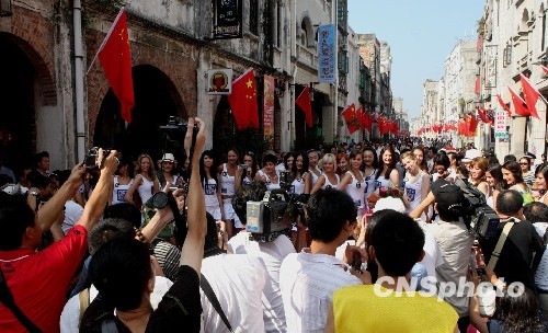 图为世界比基尼佳丽吸引游客摄影者。中新社发 钱兴强 摄