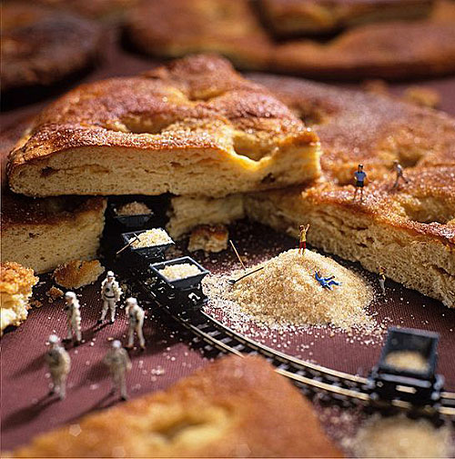 37岁的Akiko Ida和39岁的Pierre Javelle凭借杰出的想象,把食物跟玩偶制作成形态各异的风景图画。在巴黎的家庭工作室里,为了能够达到逼真和震撼的效果,这对摄影艺术二人组花费了数百小时,用极小的工具制作了“微型”系列。Akiko说,“如果回到童年,我会把各种食品都拍下来,然后在日志当中将他们进行分类”。