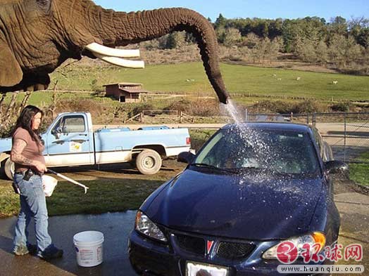 美国一野生动物园为了应对信贷紧缩,竟然聘请大象为游客洗车。这项举措吸引了不少游客,增加了门票收入。这三只大象分别叫提克、爱丽丝和乔治。当它们洗车时,你不用担心这些家伙会犯下什么错误,因为这些大象能够灵巧地用鼻子拿起抹布 和海绵对车体进行擦拭。在这家野生动物园新开张的“大象洗车处”里,司机可以与这些大象亲密接触,洗一次车的费用仅为20美元。