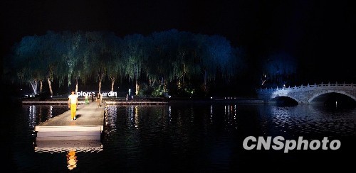 10月24日晚,皮尔·卡丹2010春夏时装发布会在北京举行,京城红领巾公园湖面上搭起的水中T台风格别样,图为模特在水中T台展示时装。 中新社发 钱兴强 摄