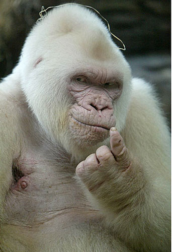 这只大猩猩名为雪花,1964年出生,1966入住巴塞罗那动物园,一生都生活在那里,2003年死于皮肤癌。它是现今发现的唯一的白化病大猩猩。