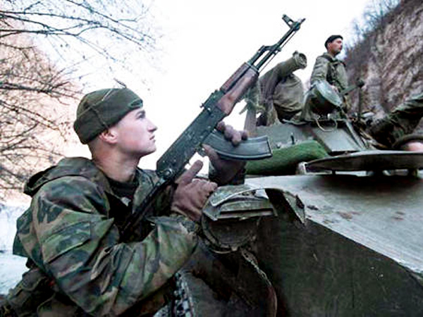 图为部署车臣俄军士兵使用AKM-47突击步枪。