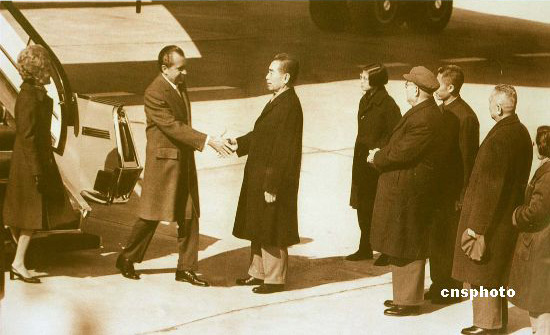 一九七二年二月,美国总统理查德尼克松访华,打开了中美两国关系正常化的大门。图为周恩来总理到北京机场迎接尼克松总统。