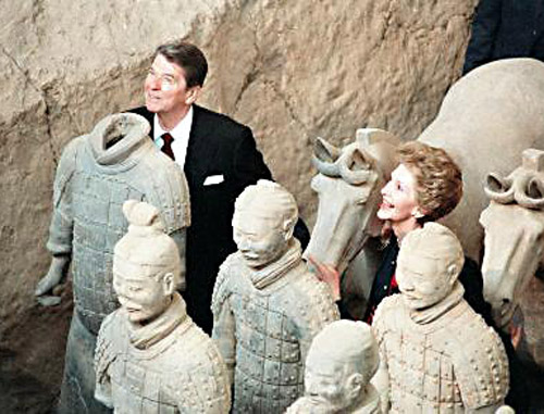 1984年(4月26日-5月1日),美国总统里根访华。图为1984年4月美国总统里根和夫人南希参观陕西秦始皇陵兵马俑。图片来源:新华网