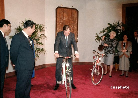 1989年2月25日-26日,美国总统布什访华。老布什与中国的渊源始于1974年,他在北京美国驻中国联络处待了13个月,就回国出任中央情报局局长去了。图为李鹏总理夫妇向访华的美国总统布什伉俪赠送两辆自行车。郑瑞德 摄