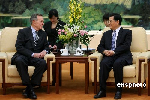 图为2006年12月13日,胡锦涛在北京会见美国前总统乔治布什。中新社发 盛佳鹏 摄
