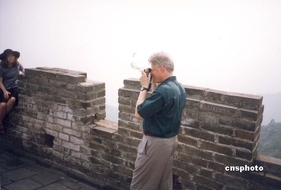 1998年6月25日-7月3日,美国总统克林顿访华。图为克林顿在长城为女儿切尔西拍照。