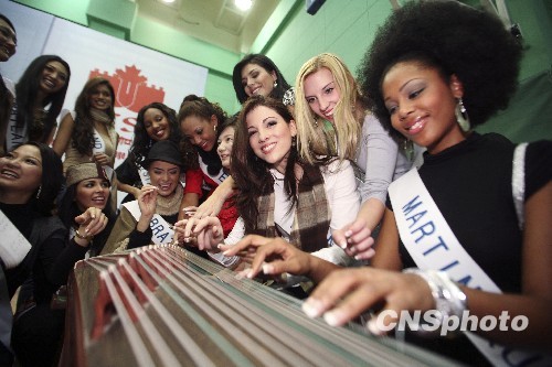 11月14日,来自70多个国家和地区的70名参加第49届国际小姐总决赛佳丽,在北京加拿大国际学校与学生共同参与“面向世界·分享爱”的主题交流会。北京加拿大国际学校及北京中加学校的学生和参赛佳丽共同演绎才艺表演。图为众多佳丽在北京加拿大国际学校内向学生们学习古筝演奏 。 中新社发 陆欣 摄