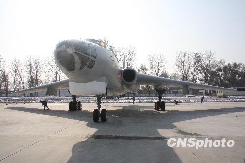 11月13日,北京沙河机场,中国自主研发的、参加国庆60周年首都阅兵的空警-2000型预警机、空警-200型预警机、轰油-6型加油机、轰-6H型轰炸机、歼-11、歼轰-7、教-8、红箭-12、红箭-9地空导弹武器系统发射车等空军主战装备一一排列,展示着中国人民空军发展壮大历史和战斗力发展新水平。图为轰-6H。中新社发 国刚 摄