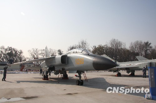 11月13日,北京沙河机场,中国自主研发的、参加国庆60周年首都阅兵的空警-2000型预警机、空警-200型预警机、轰油-6型加油机、轰-6H型轰炸机、歼-11、歼轰-7、教-8、红箭-12、红箭-9地空导弹武器系统发射车等空军主战装备一一排列,展示着中国人民空军发展壮大历史和战斗力发展新水平。图为歼轰-7。中新社发 国刚 摄