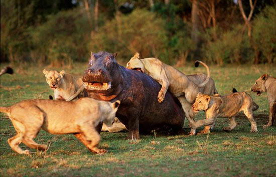 这张照片也摄于马赛马拉国家公园,一群狮子在攻击一只河马。
