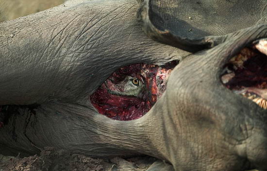 一只狮子的眼睛透过死象的身体,放出凶光,摄于非洲南部博茨瓦纳的萨谬提地区。