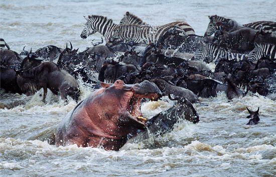 河马这个欺软怕硬的家伙,打不过狮子,却可以欺负牛羚。