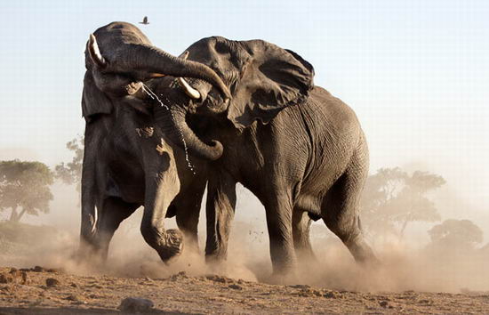 两只非洲象干起架来。摄于博茨瓦纳的萨谬提地区。
