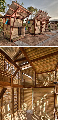 2、蒂因建筑师:“蒂因建筑师”是泰国一个由建筑专业的学生组成的非盈利组织,他们最近设计了一种独特的木制简易房屋。这个房屋可以收集雨水再利用,独特的屋顶设计有利于自然通风,房屋的建筑材料是竹子,而且当地盛产竹子。