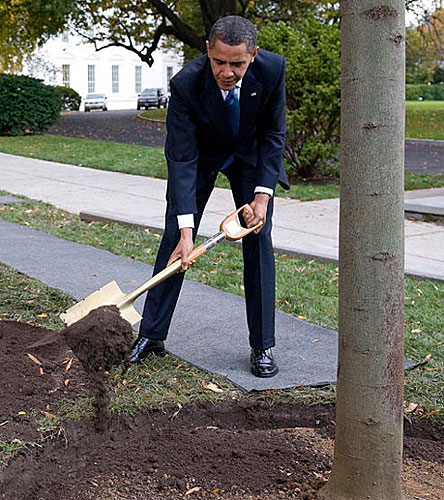 种树:2009年10月28日,美国华盛顿,总统奥巴马在白宫北草坪上植树。