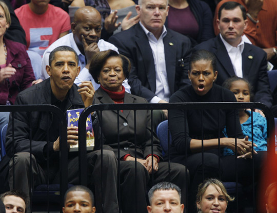 吃零食看球赛:2009年11月28日,美国总统奥巴马和他的家人在华盛顿观看了一场全美大学生篮球比赛。