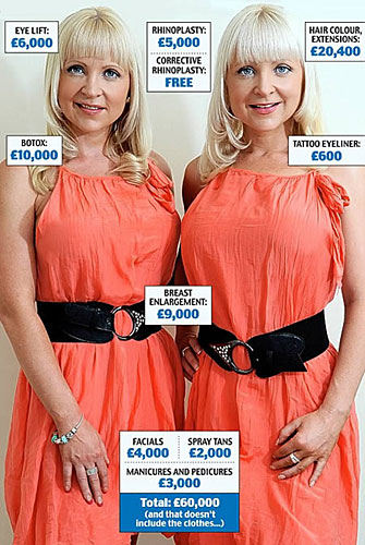手术时,她们的肚皮上写着各自的名字首字母,这样医生才能够区分她们。如今姐妹两人34岁,她们一起做过隆胸、眼部去皱、纹身和Botox注射。