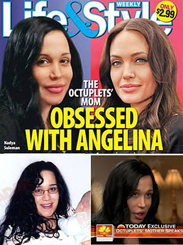 以安吉丽娜-朱莉为模板:娜迪亚-苏乐曼在刚刚生下了八胞胎之后,据说打算整形为安吉丽娜-朱莉。美国著名整容医生Anthony Youn说,娜迪亚和安吉丽娜长相极为相似,她们的额部几乎完全相同。Youn称,娜迪亚很可能做过丰唇、隆鼻手术,才会这么像安吉丽娜。