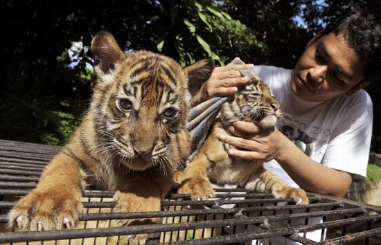 这两只苏门答腊虎只有两个月大,它们是在雅加达动物园出生的。为了拯救老虎免遭灭绝,印度政府出台一方案,允许人们领养老虎当宠物,当然它们必须是在人工饲养条件下出生,这样一对小老虎的价格为10万美元。