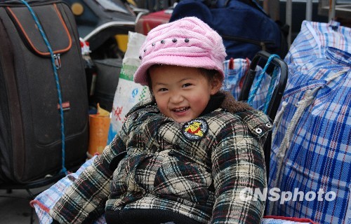 2月6日,江苏镇江长途汽车站里跟随父母返乡的孩子们纯真灿烂的笑脸令人印象深刻。中新社发 封波 摄