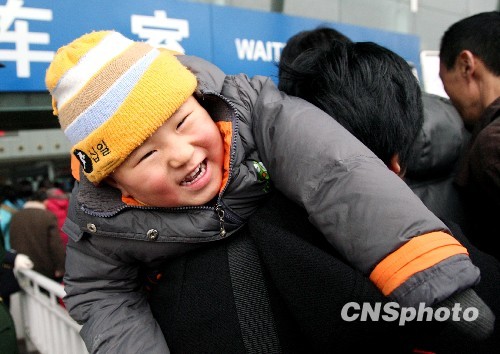 1月31日是2010年春运的第二天,在异乡打工的人们陆续开始返乡旅程,南京火车站里,许多返乡的旅客满怀回家的喜悦。中新社发 钟山 摄