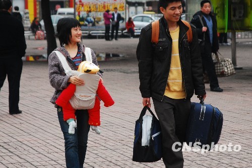 2月1日,全国春运进入第三天,湖南郴州火车站前广场,回家的旅客匆匆走过。随着虎年春节的临近,民工返乡流量明显上升,探亲流逐渐增多,年的味道渐浓。中新社发 贺茂峰 摄