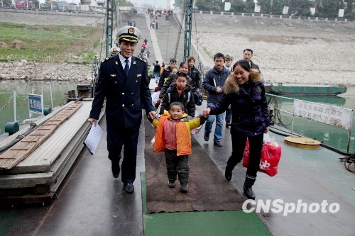 2月7日,春运第九天,长江宜昌江段连续四天遇雾,能见度受到影响,但进出川客货船仍安全畅通。今天进出川普客船、高速客船52艘,进川旅客8800余人,是今年春运以来进川最多的一次。 长江海事开辟“绿色通道”,宜昌海事局出动18艘海巡艇,200名海事执法人员监守在坝区、桥区、港区,对进出川客船实行优先进港、优先过闸,并实行条条客船出港安全检查,春运至今,进川农民工没有一人滞留、没有一艘客船超载、没有发生冒雾航行,进出川客船“零事故”,农民工高高兴兴乘船回家。中新社发 望作信 摄