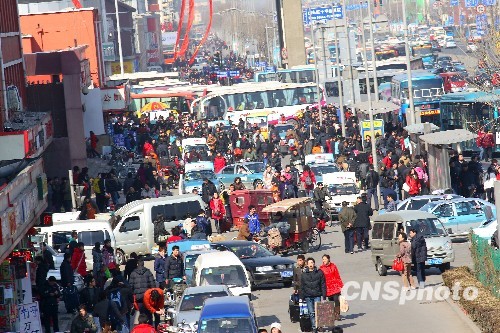 2010年2月19日,济南市长途汽车站外的人车汹涌。当日是春节长假的最后一天,公路、铁路、航空客运都迎来节后返程客流高峰期。中新社发 俄国庆 摄