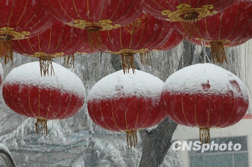 2月28日正月十五,山东邹平县春雷阵阵,雪花飘飘,雪打花灯,分外美丽。中新社发 董乃德 摄