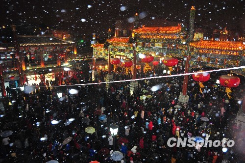2月28日,虎年元宵,大批北京市民冒雪来到前门商业街,参观传统的上元天街灯会。中新社发 余明 摄