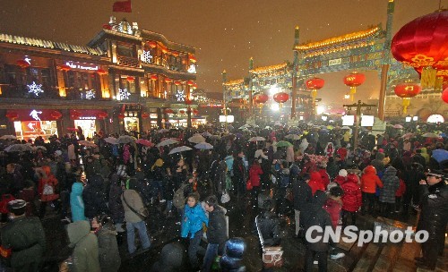 2月28日,虎年元宵,大批北京市民冒雪来到前门商业街,参观传统的上元天街灯会。中新社发 余明 摄