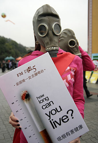 3月1日,杭州开始全城控烟,一家电台主持人头戴面具,举着禁烟海报加入控烟宣传行列。图片来源:新华网 鞠焕宗 摄