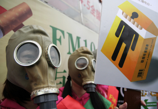 杭州一家电台在吴山广场头戴面具呼吁市民不抽烟。图片来源:新华网 鞠焕宗 摄